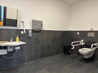 Es gibt in den Toiletten eine Sitz-Erhöhung und Griffe.